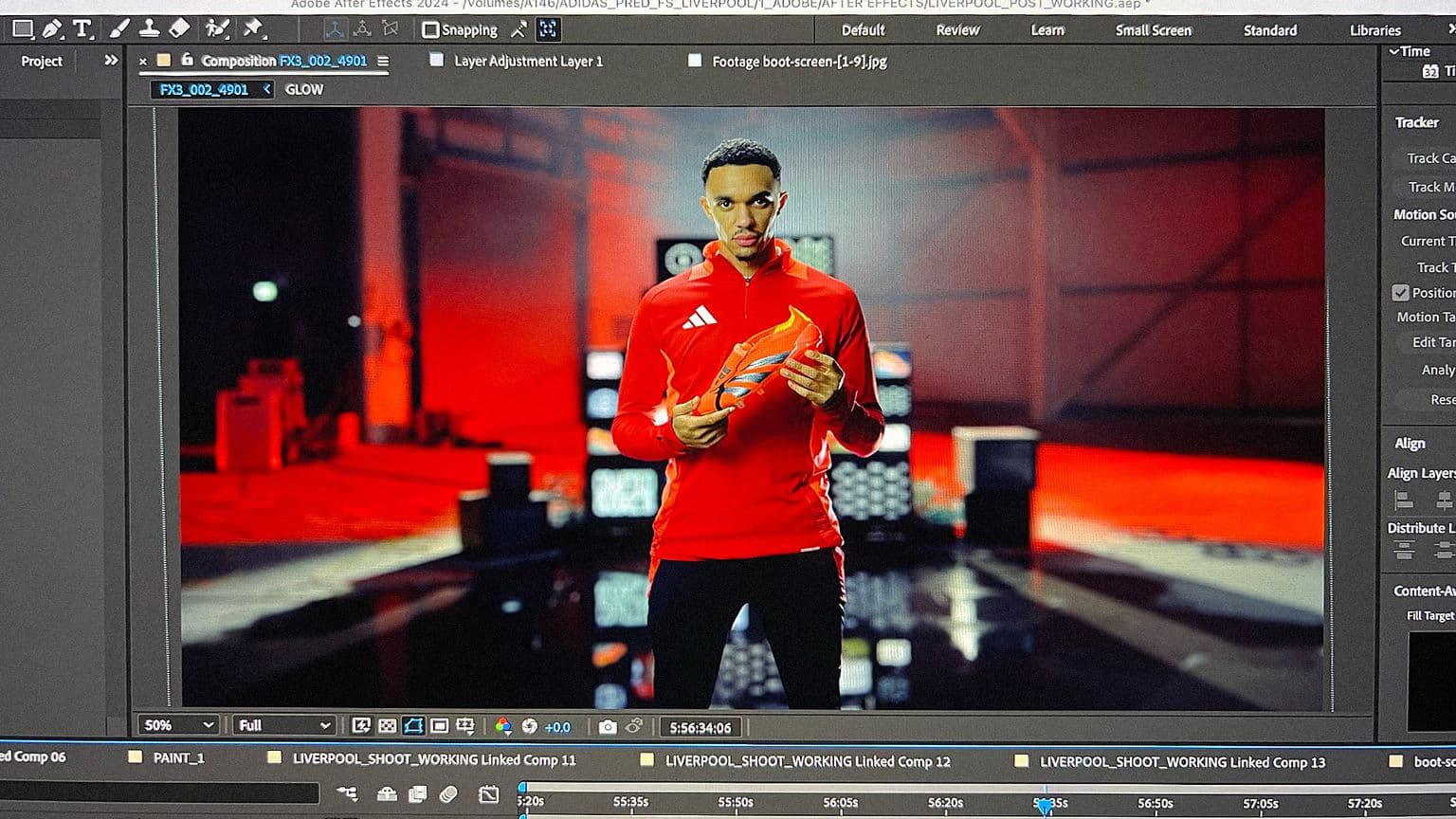 Trent Alexander-Arnold fronts the piece, initially holding the boots in-front of the TV stack, before the camera moves through the screens into on-pitch training sessions, positioning the televisions as conceptual portals between eras.