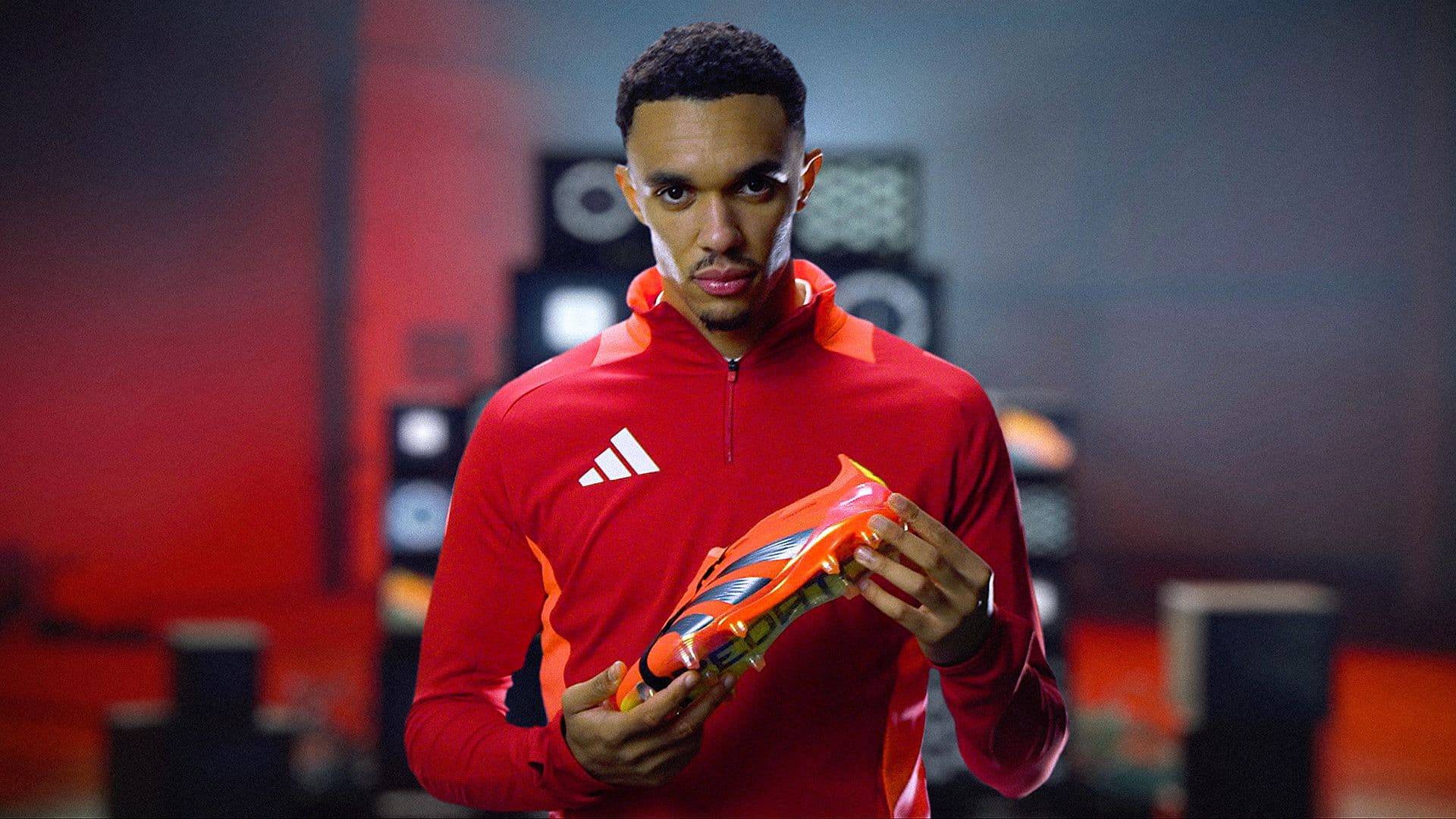 Trent Alexander-Arnold fronts the piece, initially holding the boots in-front of the TV stack, before the camera moves through the screens into on-pitch training sessions, positioning the televisions as conceptual portals between eras.